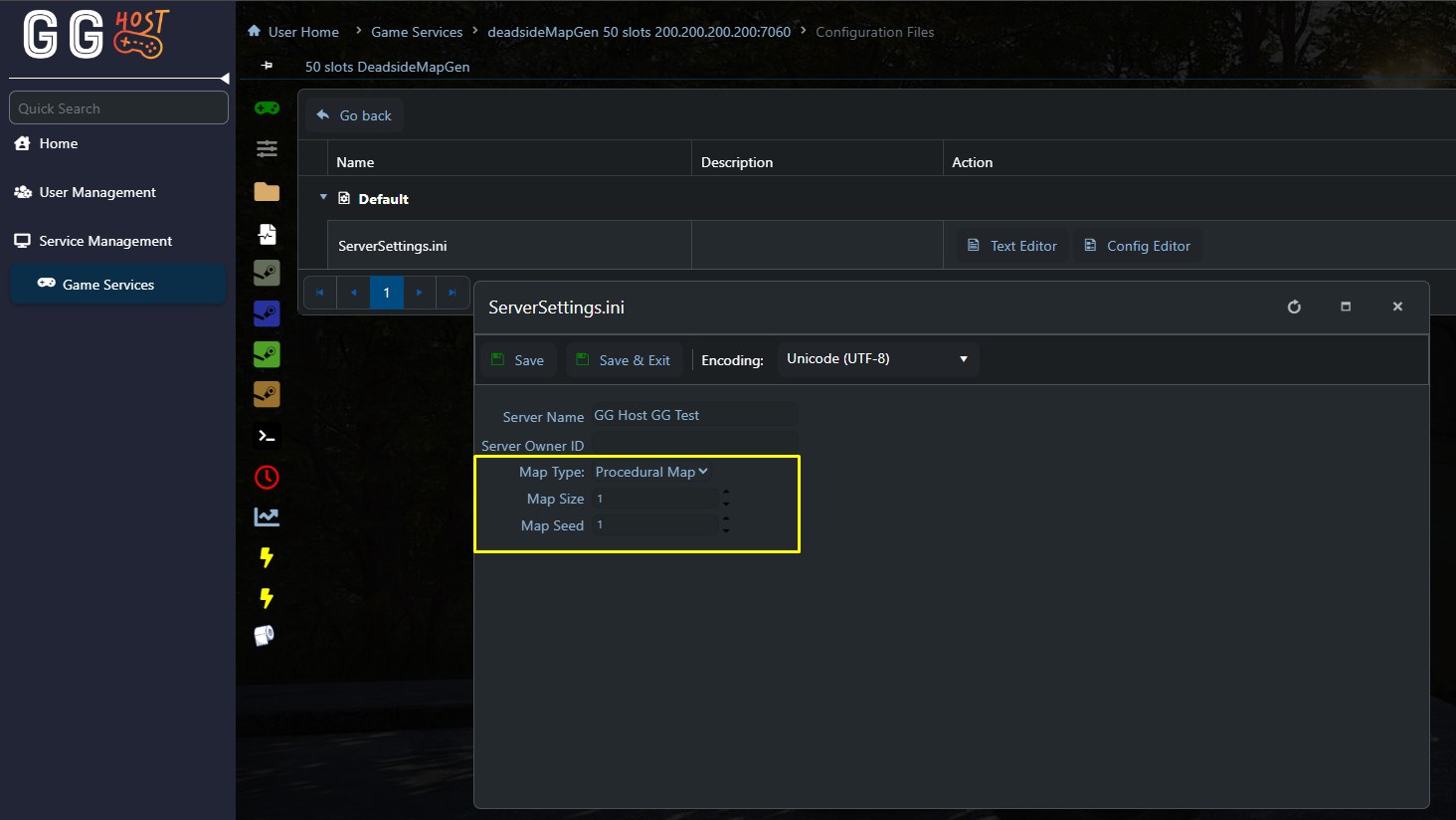 After setting Map Size and Map Seed, save the settings and start your server again so the procedural map can be generated and loaded.