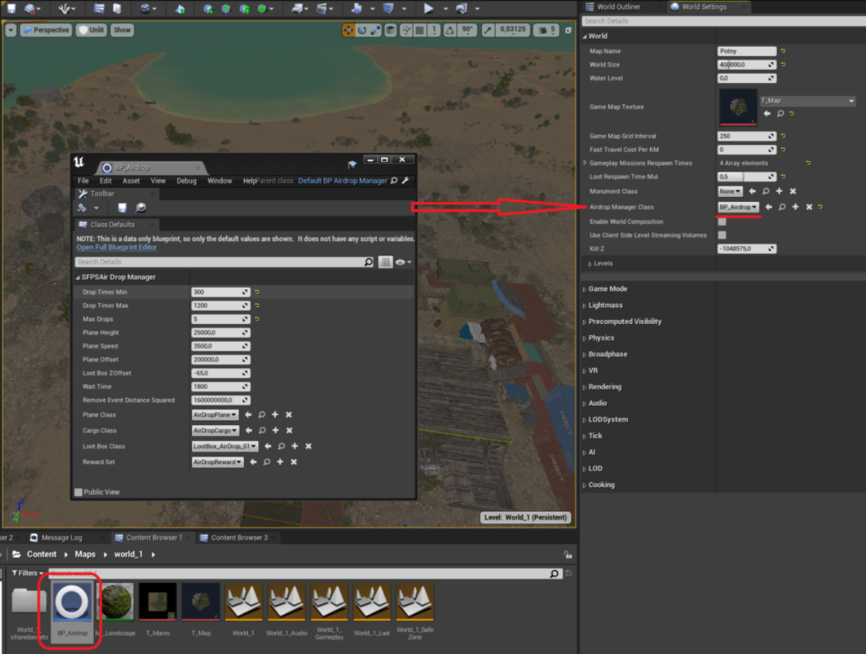 To modify airdrops, we are going to edit the BPAirdrop event manager. This can be located at Content/Maps/world0/BP_Airdrop