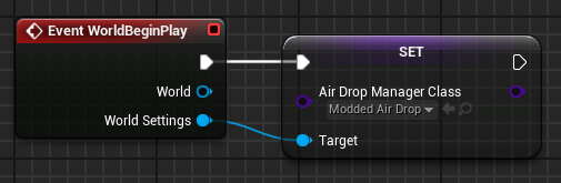 To replace BPAirdrop, make a duplicate of BPAirdrop and place it in your mod folder. Be sure to give your version a custom name. Then in your ModRegistry connect Event WorldBeginPlay to Set Airdrop Manager Class. In your Set node, select your modded BP_Airdrop.