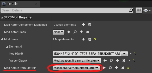 We can also add modded items to the admin list in the ModRegistry. To do this, create a duplicate of the vanilla admin list located at Content/Blueprints/ServerAdmin/ServerAdminItemListBP, and move it into your mod folder. This blueprint contains many lists of items that we also need to replace in order to add your modded item. For example, lets say we modded in a new weapon. We would want to then create a duplicate of the weapon list located at Content/Blueprints/ServerAdmin/DT_SA_Tactics, and move it into your mod folder. Open this list, and add your modded weapon into the list. Assign the new list to your modded admin list. Finally, we assign the new admin list in the ModRegistry in the Mod Admin Item List BP dropdown menu.