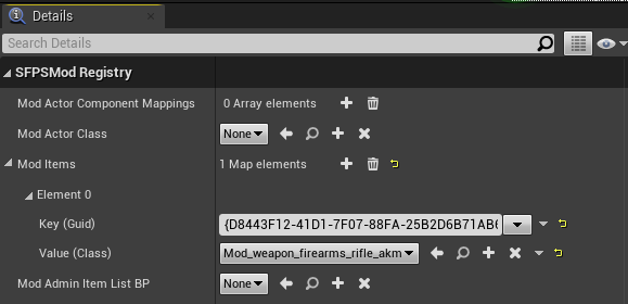 To register a modded item, open the ModRegistry and go to the details. Under Mod Items, click the plus to register a new modded item. This will generate a new GUID Key, which you then assign to your modded item by selecting the class from the Value (Class) dropdown menu. That is all you need to do in order to register the item within the game. You will still need to have ways to make your item available in the game, for example assigning it to a trader list, loot spawners, event rewards, ect.