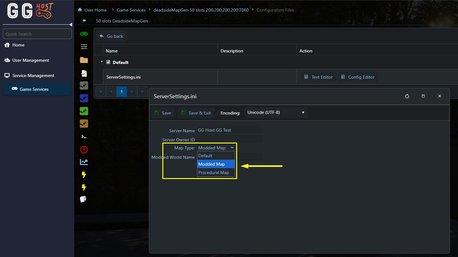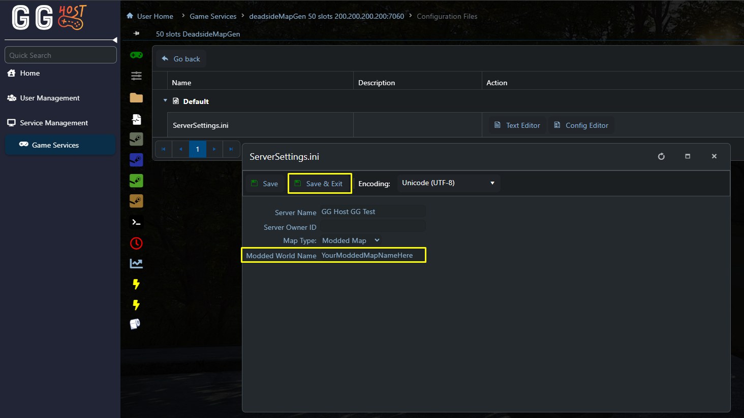 This will create a new field titled Modded World Name. Here you write the name of the modded map you would like to run. Important: the name must exactly match the map name defined by the mod author to run. If the name is incorrect, the server may fail to start or default back to World_0. If you don't know the exact world name, you may need to contact the mod author for that information.